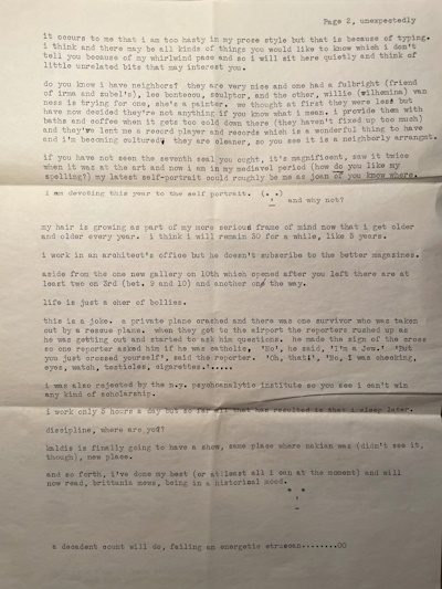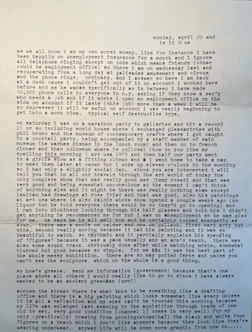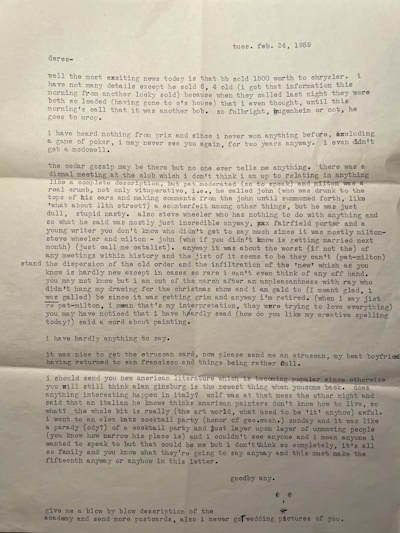 i should send you new american literature which is becoming popular since otherwise you will still think alan ginsburg is the newest thing when you come back. does anything interesting happen in italy? wolf was at that mess the other night and said that an italian he knows thinks american painters don’t know how to live, so what? the whole bit is really (the art world, what used to be ‘it’ anyhow) awful. i went to an alex katz cocktail party and just layer upon layer of unmoving people (you know how narrow his place is) and i couldn’t see anyone and i mean anyone i wanted to speak to but that could be me but I don’t think so completely, it’s all so family and you know what they’re going to say anyway and this must make the fifteenth anyway or anyhow in this letter.